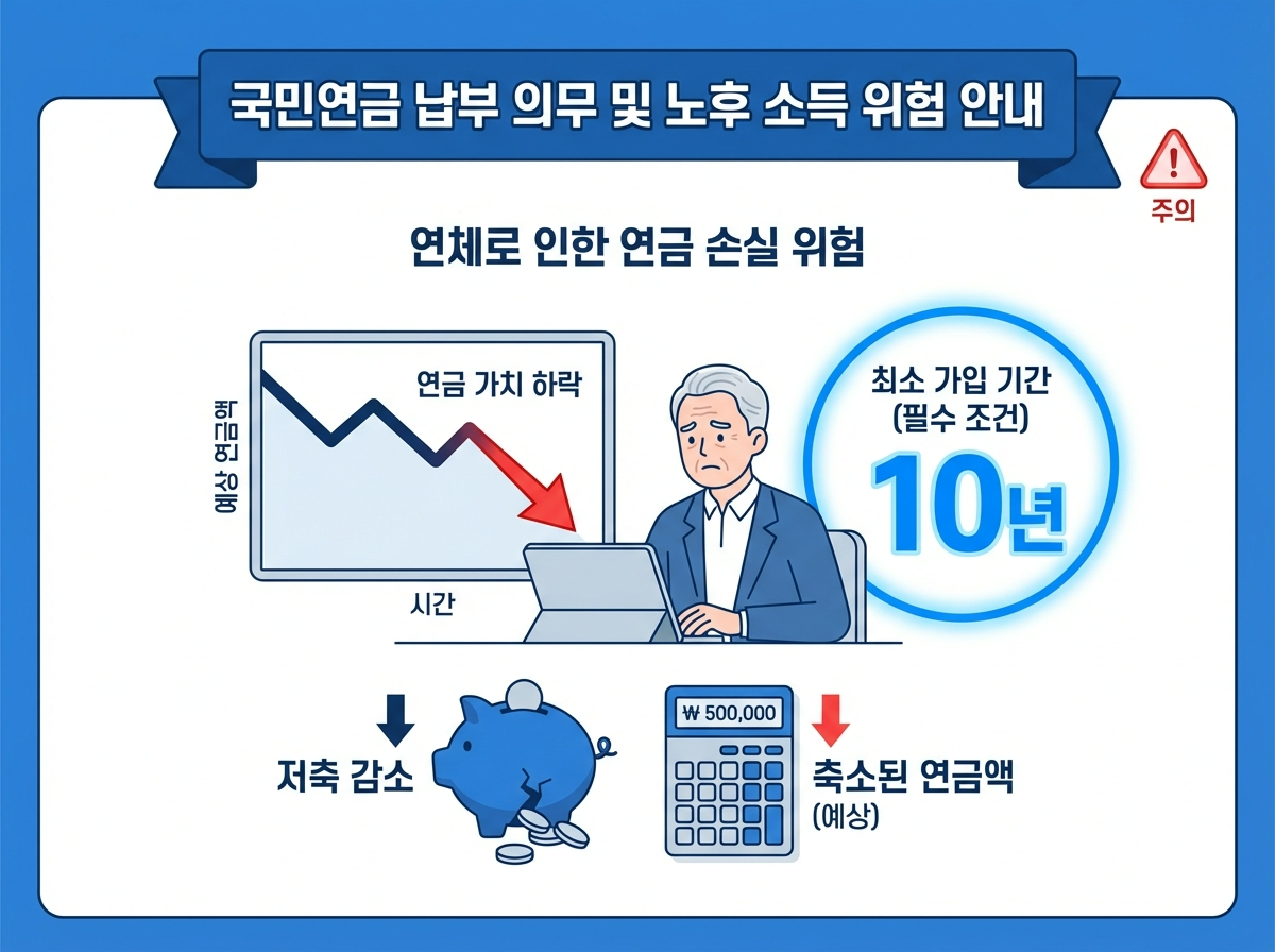 국민연금은 최소 가입 기간 10년을 채워야 평생 연금을 받을 수 있습니다. 미납은 이 기간을 깎아먹는 주범입니다.